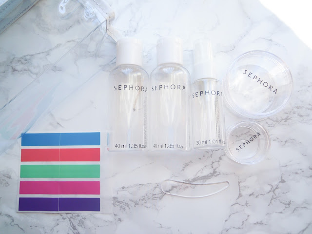 Sephora Weekend kit je idealan za kraća putovanja. Dolazi u kvalitetnom neseseru, izradjenom od tvrde plastike, i providan je. Zatvara se na zip (rajfešluzom). U njemu dobijate dve bočice sa poklopcem zapremine 40 ml, jednu sa sprejom od 30 ml, kutijicu sa poklopcem od 50 ml, i istu takvu samo od 10 ml.